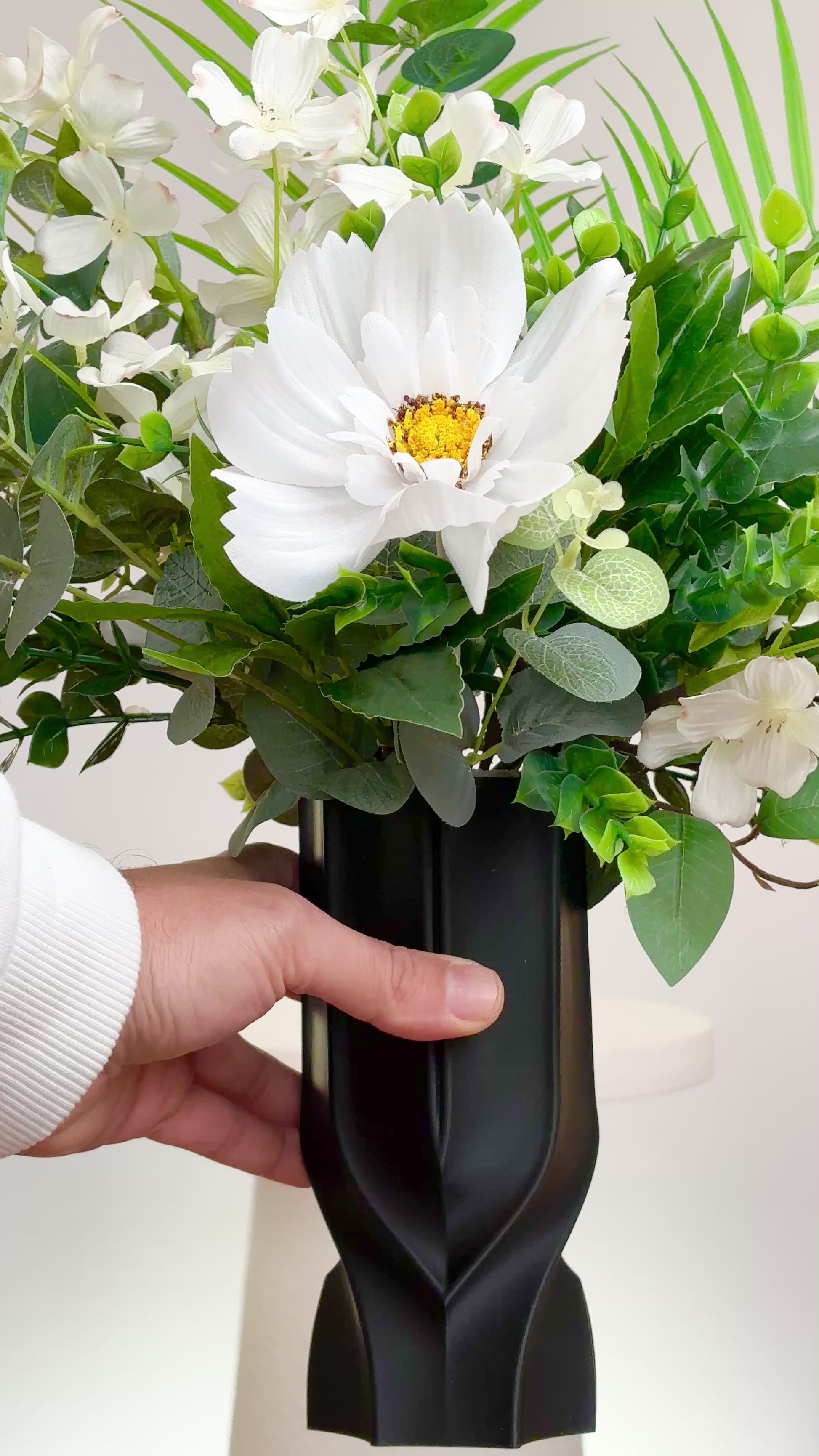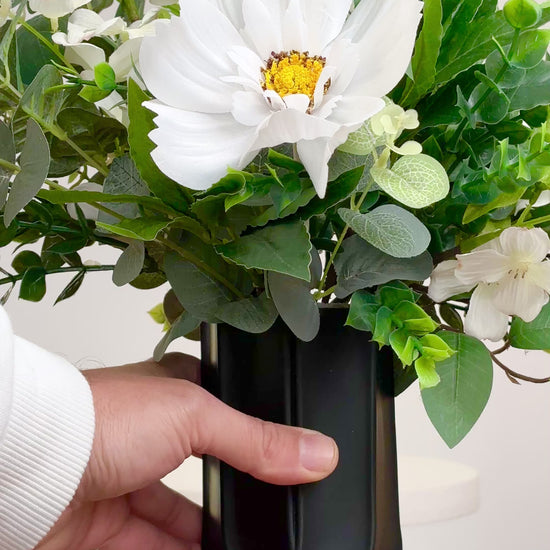Each petal and leaf is thoughtfully placed to create a sense of balance — fresh, minimalist, yet luxuriously full. The matte black vase adds a bold architectural edge, making this piece a perfect fusion of nature and design.