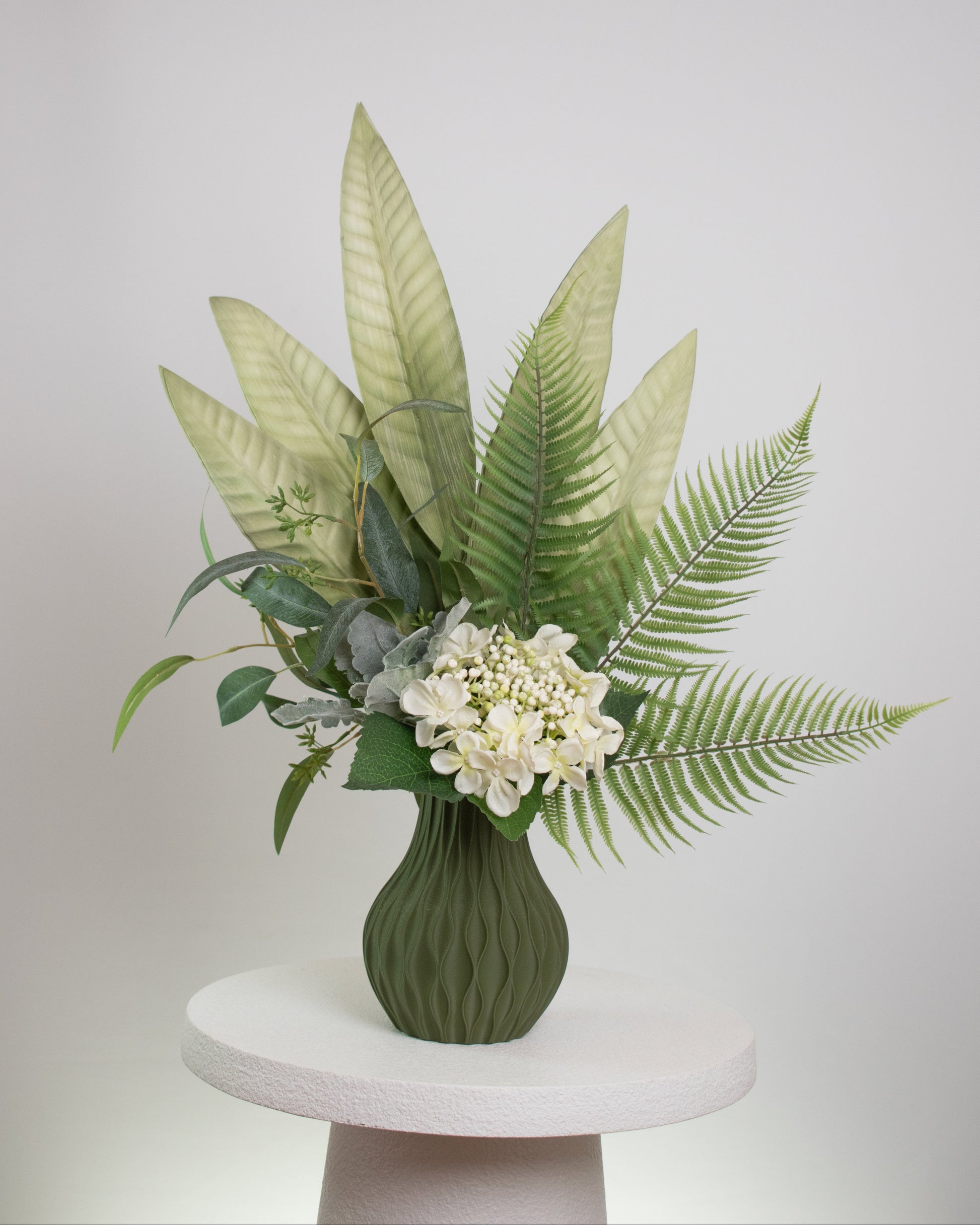 Elegant, refreshing, and full of natural charm, Verdant Harmony captures the tranquil beauty of lush greenery in perfect balance. Featuring a graceful mix of fern fronds, broad tropical leaves, soft eucalyptus, and delicate ivory blooms, this arrangement evokes the calm essence of a peaceful garden retreat.
